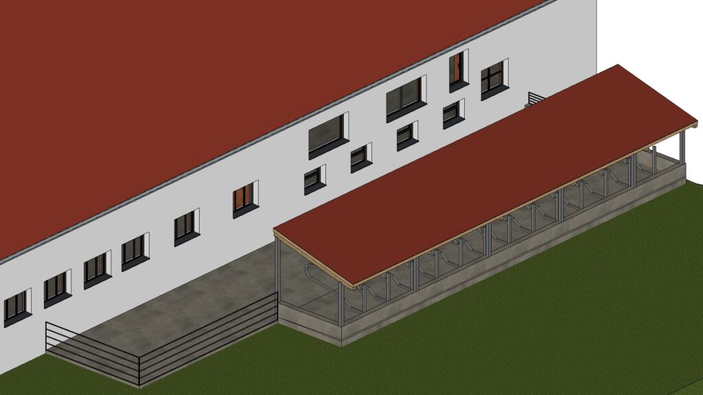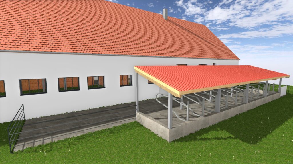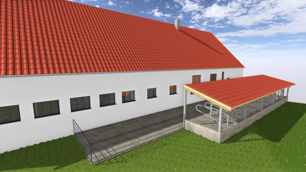 Für die Erweiterung eines bestehenden Kuhstalls mit 14 zusätzlichen Liegeplätzen haben wir die vollständige Genehmigungsplanung erstellt und den Bauantrag ausgearbeitet. Grundlage war ein Aufmaß des Bestands vor Ort, auf dem wir die Entwurfs- und Genehmigungsplanung aufgebaut haben.