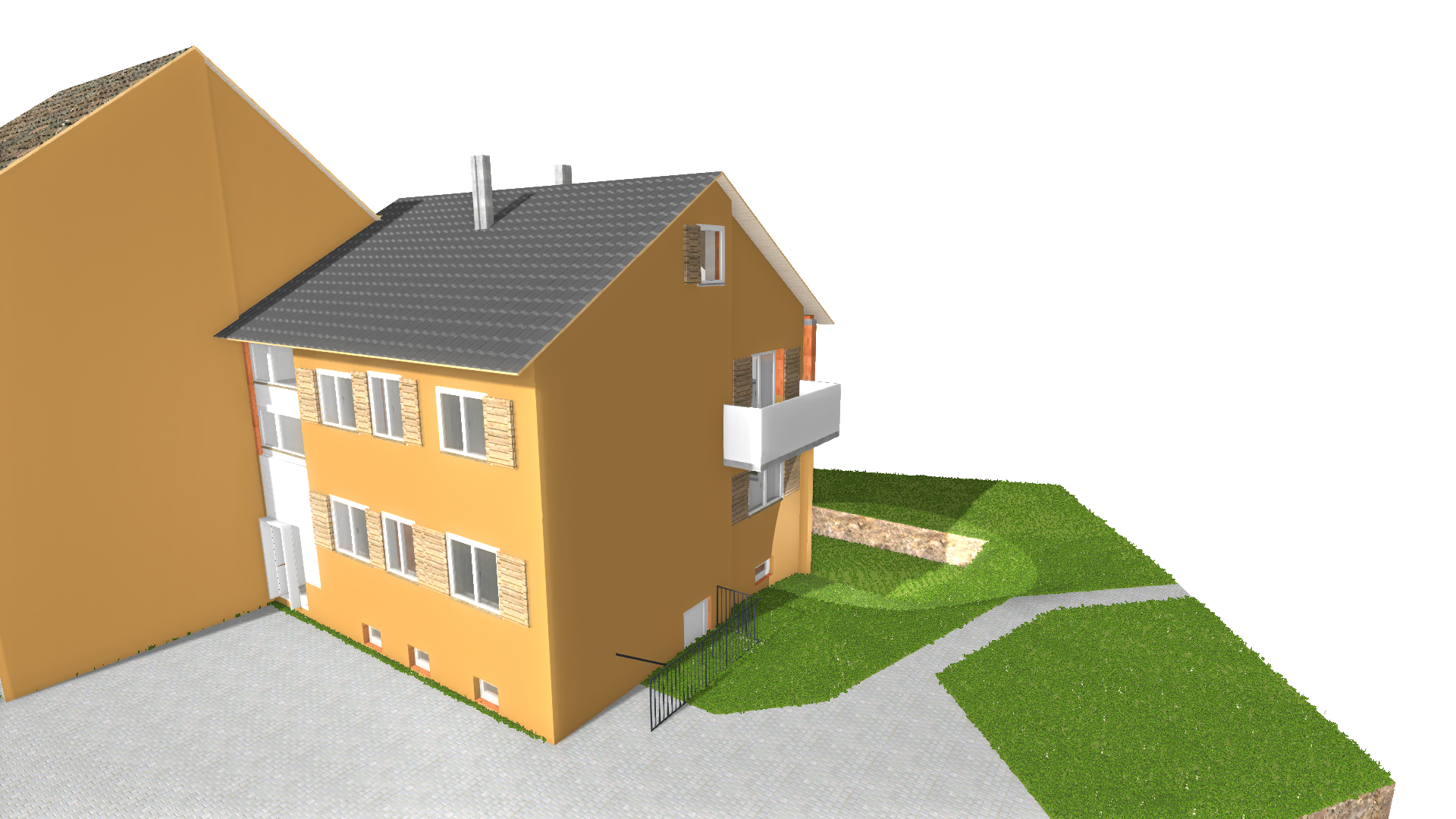 Im Anschluss haben wir ebenfalls die Außenanlagen umgesetzt: Der Hof wurde mit neuen Parkflächen gepflastert, zudem entstand eine Garage in Massivbauweise mit Flachdach und Begrünung.