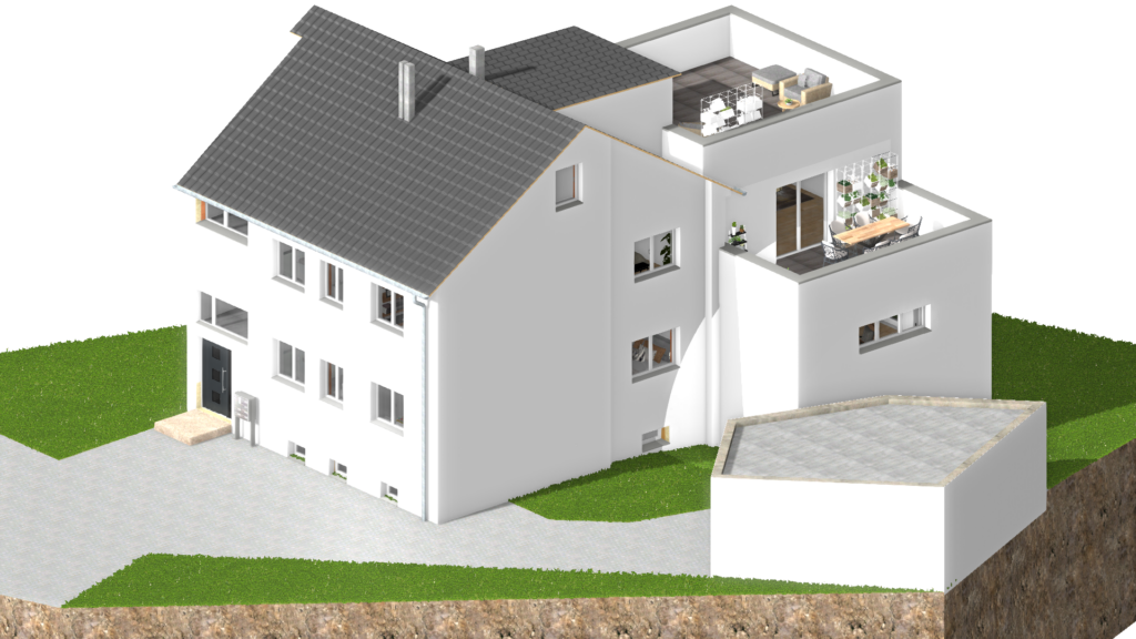 Ein bestehendes Mehrfamilienhaus mit drei Wohneinheiten wurde von Grund auf kernsaniert und im Zuge eines Anbaus auf insgesamt fünf Wohneinheiten erweitert – umgesetzt nach KfW 55 EE Standard.