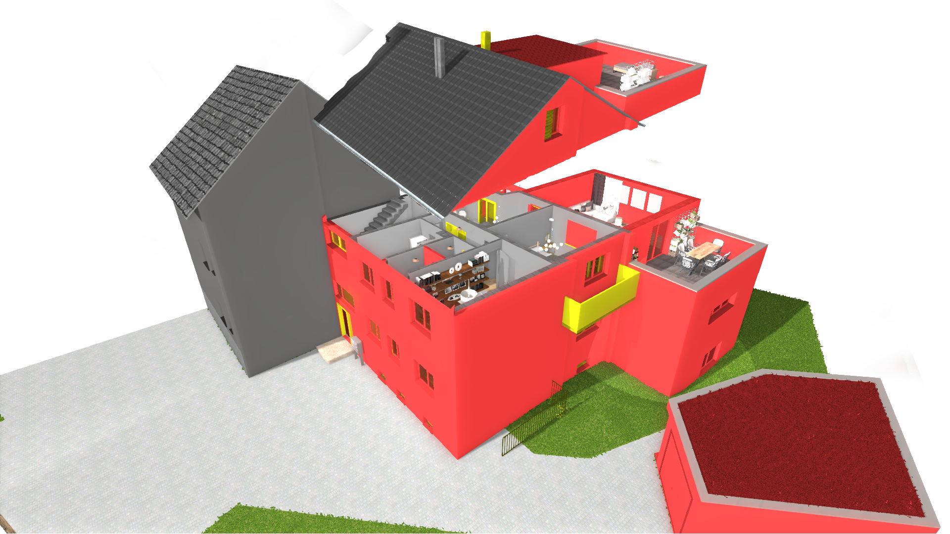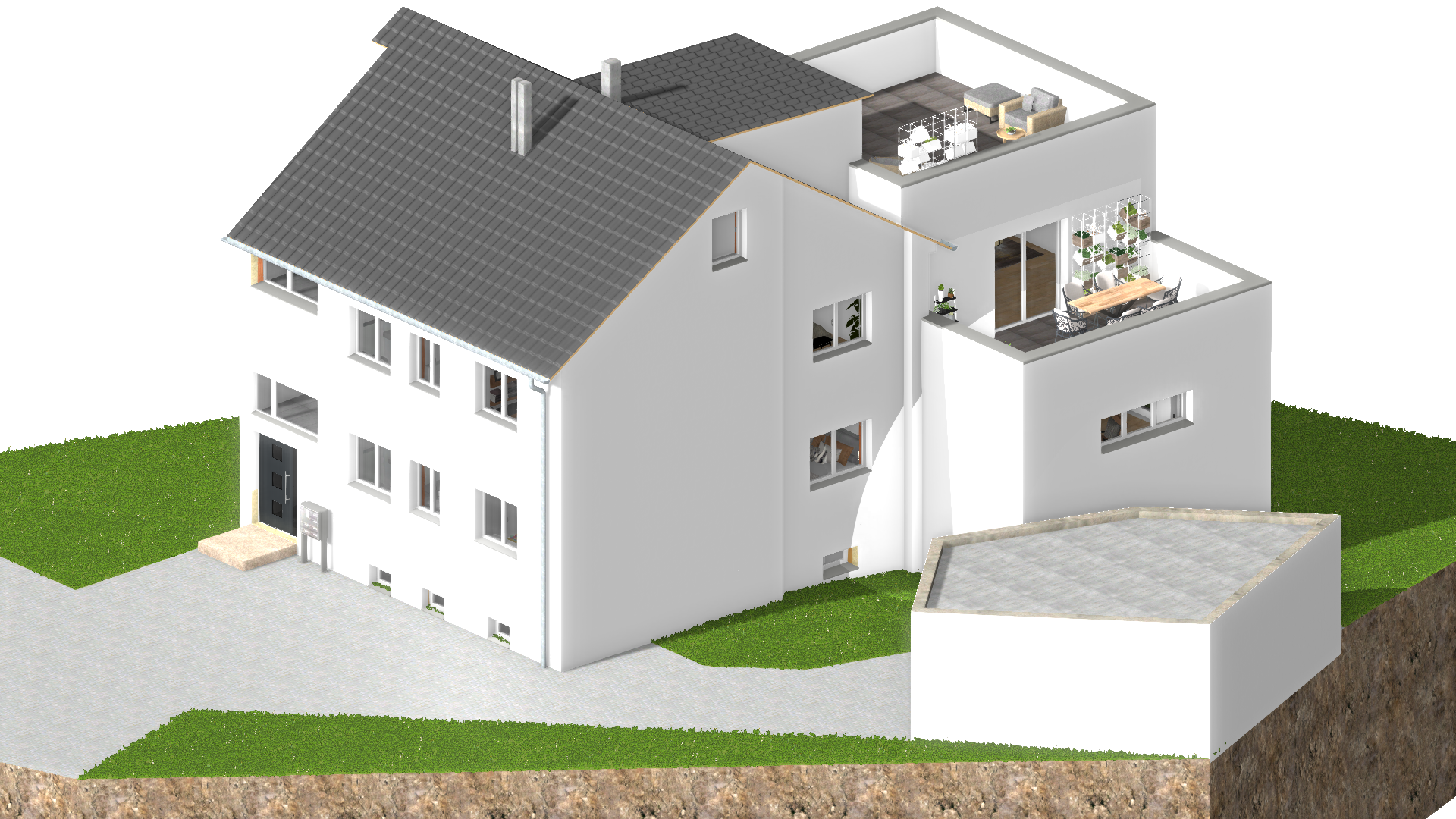 Der Anbau schafft zusätzlichen, vermietbaren Raum über mehrere Ebenen: Im Keller entstanden zwei neue Apartments, im Erdgeschoss ein großzügiger zusätzlicher Wohnbereich, im Obergeschoss ein weiterer Wohnraum mit Dachterrasse sowie im Dachgeschoss eine große Dachterrasse.