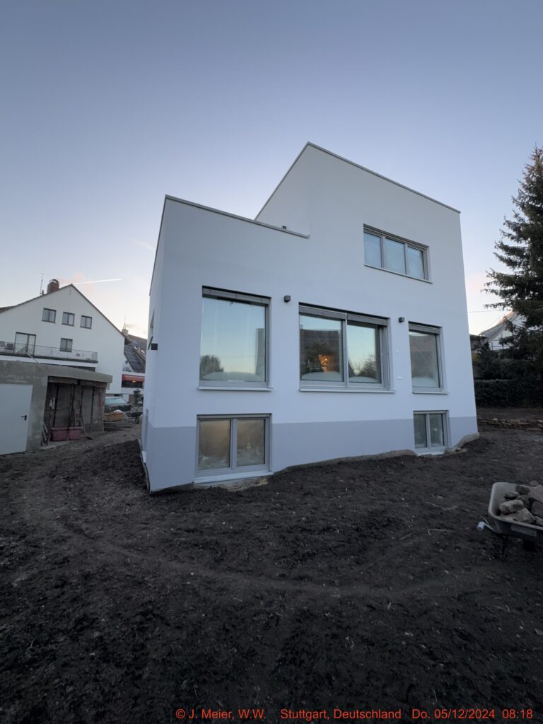 Das Gebäude wurde bis auf den Rohbau entkernt und energetisch vollständig neu aufgebaut: Außendämmung, neue Fenster mit 3-fach-Verglasung sowie eine umfassende Erneuerung der gesamten Haustechnik. Im Keller wurde der Bodenaufbau komplett zurückgebaut, die Fläche tiefergelegt und die neue Bodenplatte mit Dämmung darunter ausgeführt. Die Außenwände wurden neu abgedichtet und in Teilbereichen unterfangen.